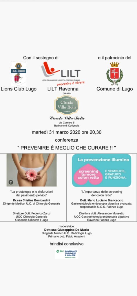 Evento imperdibile, martedì 31 marzo , ore 20,30 . C/o il Circolo Villa Bolis, via Corriera 5, Barbiano di Cotignola. Organizzato dal Lions Club Lugo – RA e dalla Lilt Proviciale Ravenna, con il Patrocinio del Comune di Lugo, con contributo della La Bcc ravennate forlivese e imolese. Buffet e brindisi finale. Laura Baldinini, presidente del Lions Club di Lugo, sottolinea la grande importanza, per la salute pubblica ed il benessere delle nostre comunità, della prevenzione dei tumori del colon-retto ( una delle principali cause di malattia e mortalità) e della cura del pavimento pelvico. La cultura della prevenzione significa, infatti, informare, sensibilizzare ed incoraggiare le persone ad aderire agli screening, ad adottare sani stili di vita ed a vigilare sui segnali del proprio corpo. In questo, il Lions Club ha un ruolo fondamentale: essere vicino alla comunità , abbattere paure e pregiudizi e diffondere corrette informazioni. Promuovere la cultura della prevenzione, dunque, non e’ solo un atto sanitario, ma un gesto di responsabilità sociale, che mira a costruire una comunità più consapevole, più informata e, soprattutto, più sana.