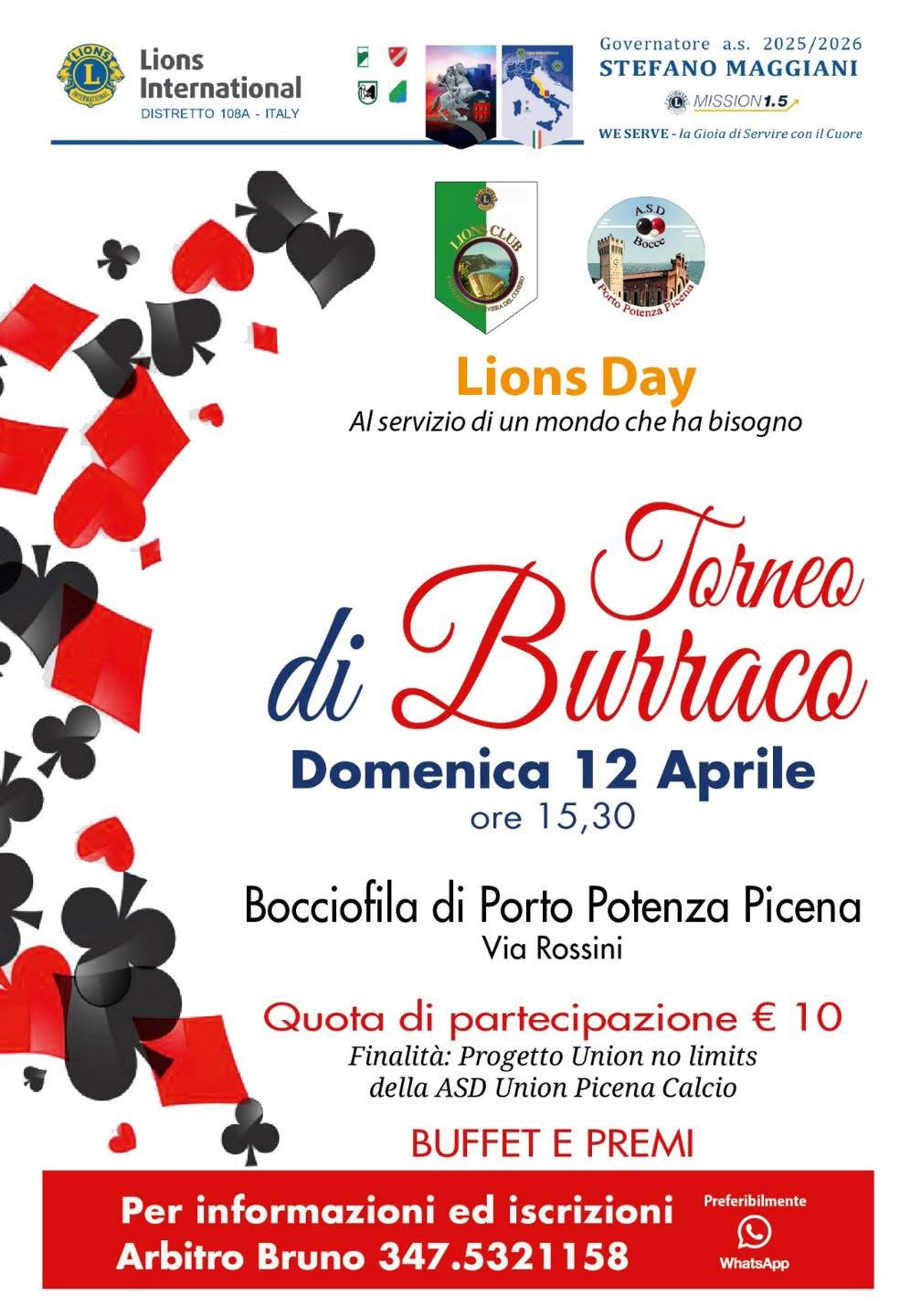 Torneo di Burraco il pomeriggio del 12 aprile La tua piccola quota farà grande il dono previsto alla Union Picena, un gruppo di ragazzi diversamente abili che si sta formando allo sport e allo spirito di condivisione. Nell’occasione il presidente del Lions Club Castelfidardo Rivera del Conero Nicola Antonini, illustrerà questa ed altre iniziative della stagione lionistica in corso, in occasione del Lions day! Per i dettagli seguite la locandina e partecipate numerosi!