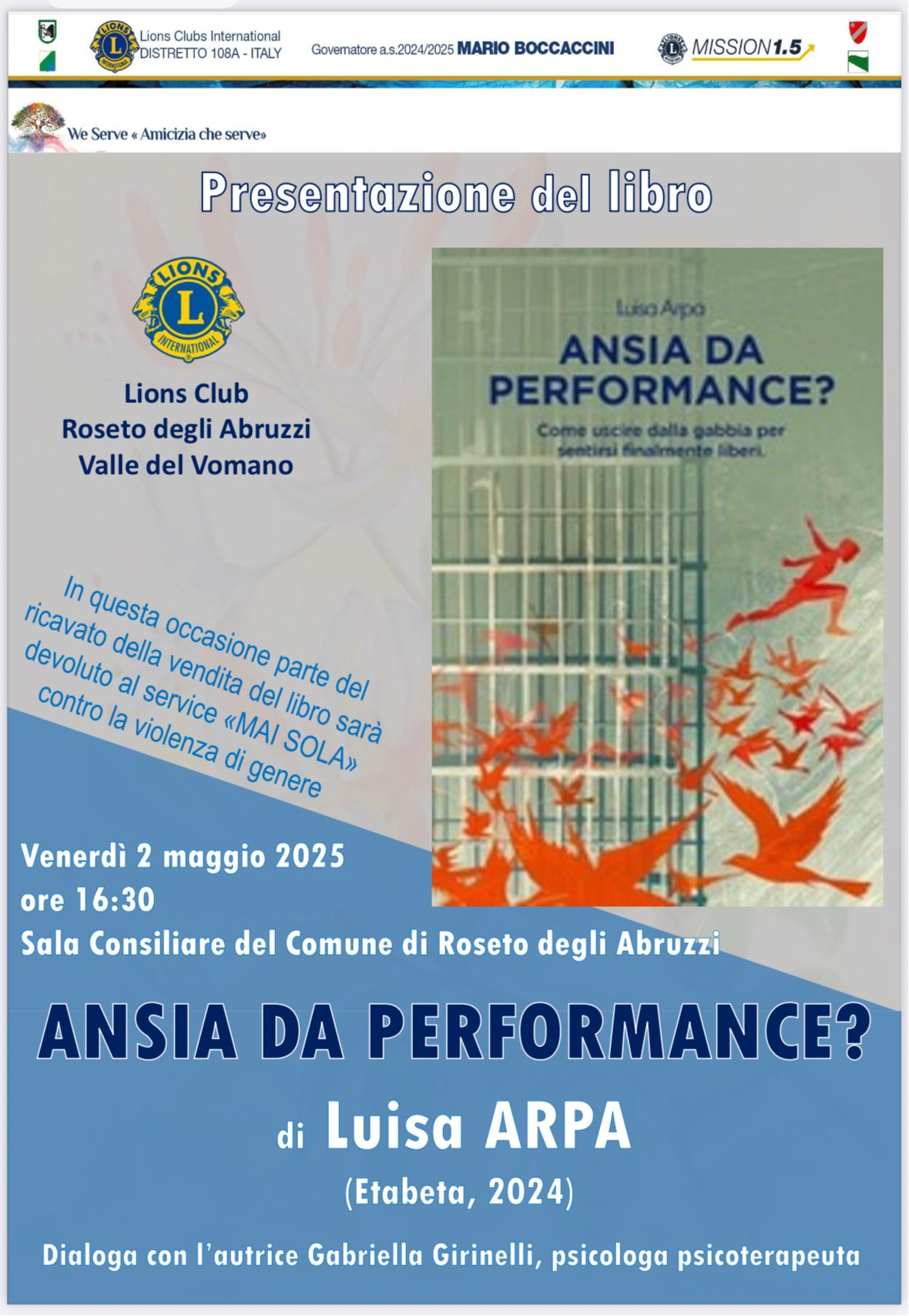 Si è tenuta ieri, nella sala Consiliare del Comune di Roseto degli Abruzzi, la presentazione del libro della Prof.ssa Luisa Arpa dal titolo “Ansia da performance? Come uscire dalla gabbia per sentirsi finalmente liberi”. L’incontro è stato magistralmente condotto dall’Autrice, con l’interlocuzione della dr.ssa Gabriella Girinelli, psicologa e psicoterapeuta, Dirigente psicologo presso il Centro di salute mentale di Giulianova (ASL Teramo). Fra i presenti molti non lions e tutti sono stati coinvolti nell’interessante racconto di esperienze che hanno portato Luisa Arpa ad approfondire studi e ricerche che infine hanno avuto esito nel libro che è anche un utile strumento e fonte di consigli per gestire l’ansia e prendere coscienza del proprio valore. Gran parte del ricavato delle vendite è stato generosamente messo a disposizione dall’Autrice del service di Zona MAI SOLA.