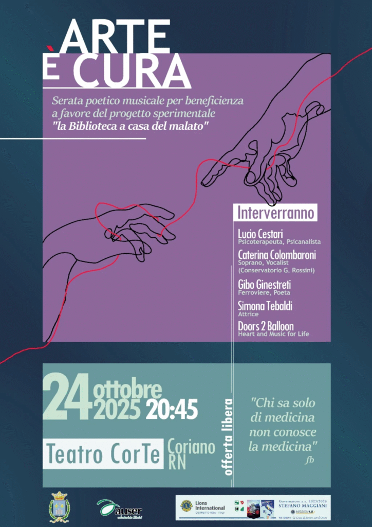 Venerdì 24 ottobre alle ore 20:45 al teatro Corte di Coriano il Lions Club Riccione presenta un evento che unisce arte, musica e solidarietà. “Arte e (è) cura” è una serata poetica musicale di raccolta fondi a favore del progetto sperimentale nel comune di Coriano “La Biblioteca a casa del malato”, la cui finalità è realizzare momenti di lettura al domicilio di persone che per le loro condizioni di salute sono impossibilitate ad accedere ai servizi bibliotecari e ai cittadini con gravi impedimenti fisici, che amano o desiderano scoprire il piacere della lettura al fine di contribuire a ridurre l’isolamento ed il ritiro forzato dalla vita sociale, dunque la lettura come generatore di inclusione. La serata gode del patrocinio del Comune di Coriano ed è organizzata in collaborazione con Auser. Ingresso ad offerta libera.