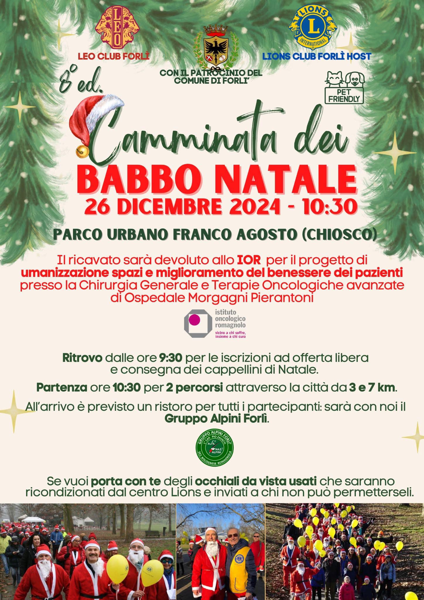 Anche l’ottava edizione della Camminata dei Babbo Natale, promossa dal Lions Club Forlì Host e dal Leo Club, ha superato ogni aspettativa sia per il numero dei partecipanti, oltre 1.000 (il maggiore in assoluto rispetto a quelle precendenti), sia per i fondi raccolti e cioè 5.000 euro. La cifra sarà destinata all’Istituto Oncologico Romagnolo (IOR) per finanziare i lavori di umanizzazione del reparto di Chirurgia Generale e Terapie Oncologiche avanzate dell’Ospedale “Morgagni-Pierantoni” e per fare in modo che gli ospiti del dipartimento condotto dal professor Giorgio Ercolani abbiano locali più accoglienti. Inoltre sono stati raccolti più di 100 occhiali usati da vista che, una volta rigenerati dall’apposito centro Lions nazionale, verranno inviati in nazioni in cui ci sono molte persone che non hanno le condizioni economiche per poterseli permettere. Come gli altri anni la camminata si è snodata per le vie del centro della città per poi ritornare al punto di partenza, dove ad aspettare i partecipanti c’erano alcuni componenti del Gruppo Alpini Forlì che hanno offerto un ristoro. Mentre gli organizzatori hanno consegnato un omaggio ai camminatori, così come numerosi sono stati i premi sorteggiati grazie alle donazioni di alcune attività commerciali.