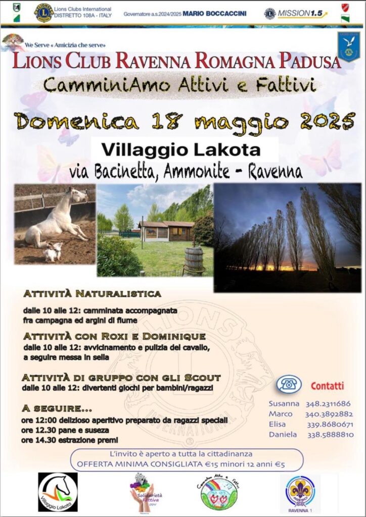 In una nuova location, Villaggio Lakota (via Bacinetta, Ammonite – RA) avrà luogo, evidenziano i Lions, un consolidato evento che unisce Attività Naturalistica (camminata tra campagna e argini dei fiumi), Attività Equestre (avvicinamento e pulizia del cavallo con messa in sella), e Attività Ludiche per Bambini (giochi e intrattenimento)