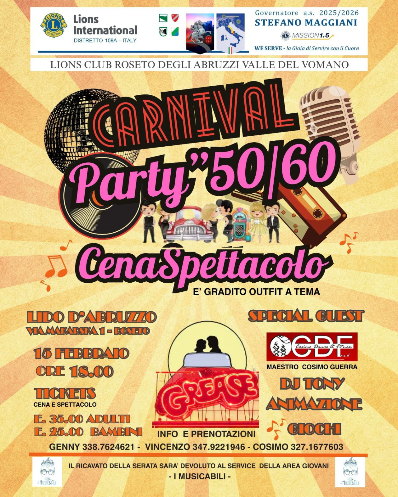 Roseto degli Abruzzi 16 febbraio 2026- Una sala gremita, musica, entusiasmo e soprattutto un forte spirito di comunità: il Lions Club Roseto degli Abruzzi Valle del Vomano, parte di Lions Clubs International, ha celebrato con grande partecipazione il “Carnival Party 50/60 – Cena Spettacolo”, trasformando una serata di festa in un autentico momento di service.