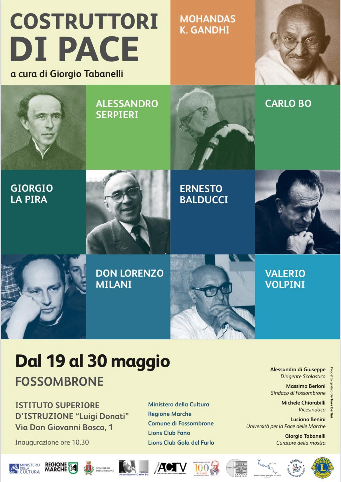 Lunedì 19 maggio alle 10,30, nell’atrio dell’Istituto d’Istruzione Superiore “Luigi Donati”, inaugura la mostra “Costruttori di Pace”. Visitabile fino al 30 maggio, l’evento è a cura di Giorgio Tabanelli ed è promosso dall’Associazioni Arte Cinema Teatro Volontariato in collaborazione con l’Associazione Carlo Bo di Urbino e le Fondazioni Giorgio La Pira e Ernesto Balducci, con il patrocinio del Ministero della Cultura, del Comune di Fossombrone, dei Lions Club di Fano e LIONS CLUB GOLA DEL FURLO (Acqualagna Cagli Fossombrone), #lionsfurlo con il sostegno del Comune di Fossombrone e della Diocesi di Fano, Fossombrone, Cagli, Pergola.