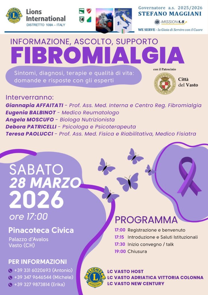 I Lions Vastesi promuovono un incontro sulla fibromialgia. La fibromialgia è una sindrome cronica multifattoriale di cui troppo poco si parla e si conosce e il cui approccio terapeutico, invece, richiede un intervento multidisciplinare. Anche per queste ragioni la fibromialgia è stata scelta dai Lions del Distretto 108 A (Romagna, Marche, Abruzzo e Molise) come tema distrettuale per l’anno sociale in corso e per conoscere meglio gli aspetti di questa patologia, di recente inserita nelle sue forme molto severe tra i Livelli Essenziali di Assistenza (LEA), i Lions Club Vasto Host, Vasto Adriatica Vittoria Colonna e Vasto New Century promuovono un evento divulgativo e di confronto nella giornata di sabato 28 marzo, a partire dalle ore 17.00 nella Pinacoteca di Palazzo d’Avalos. Interverranno Giannapia Affaitati, professore associato di Medicina interna e Centro regionale Fibromialgia; Teresa Paolucci, professore associato di Medicina fisica e riabilitativa e medico fisiatra; Eugenia Balbinot, medico reumatologo; Angela Moscufo, biologa nutrizionista; Debora Patricelli, psicologa psicoterapeuta. Tutti i dettagli in locandina per un appuntamento da non perdere.