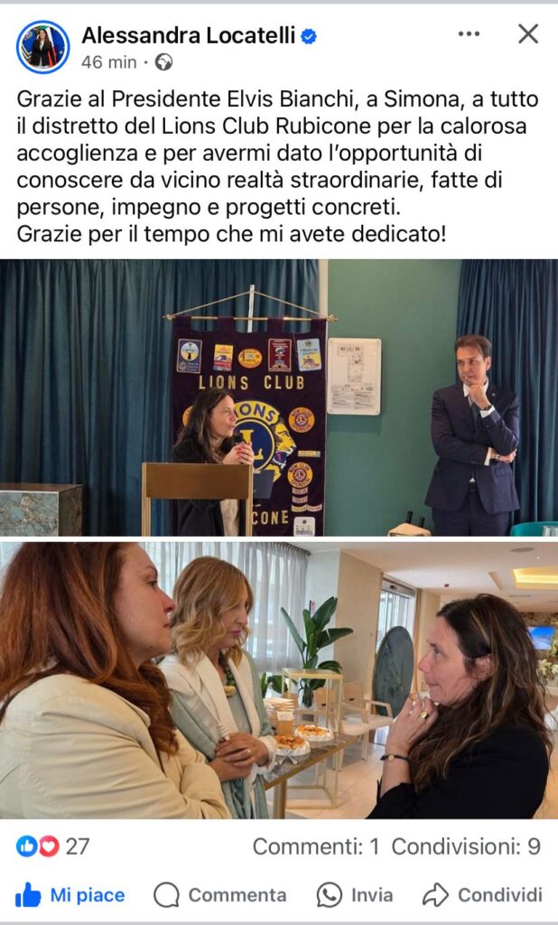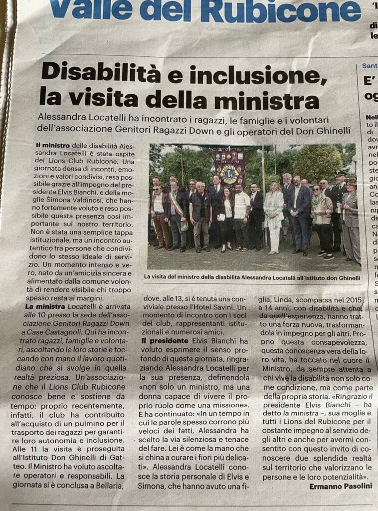 Il ministro delle disabilità Alessandra Locatelli è stata ospite del Lions Club Rubicone. Una giornata densa di incontri, emozioni e valori condivisi, resa possibile grazie all’impegno del presidente Elvis Bianchi, e della moglie Simona Valdinosi, che hanno fortemente voluto e reso possibile questa presenza così importante sul nostro territorio. Non è stata una semplice tappa istituzionale, ma un incontro autentico tra persone che condividono lo stesso ideale di servizio. Un momento intenso e vero, nato da un’amicizia sincera e alimentato dalla comune volontà di rendere visibile chi troppo spesso resta ai margini.