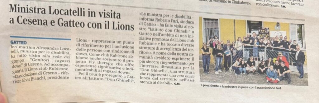 La ministra Locatelli è arrivata alle 10 presso la sede dell’associazione Genitori Ragazzi Down a Case Castagnoli. Qui ha incontrato ragazzi, famiglie e volontari, ascoltando le loro storie e toccando con mano il lavoro quotidiano che si svolge in quella realtà preziosa. Un’associazione che il Lions Club Rubicone conosce bene e sostiene da tempo: proprio recentemente, infatti, il club ha contribuito all’acquisto di un pulmino per il trasporto dei ragazzi per garantire loro autonomia e inclusione. Alle 11 la visita è proseguita all’Istituto Don Ghinelli di Gatteo. Il Ministro ha voluto ascoltare operatori e responsabili. La giornata si è conclusa a Bellaria, dove, alle 13, si è tenuta una conviviale presso l’Hotel Savini. Un momento di incontro con i soci del club, rappresentanti istituzionali e numerosi amici.