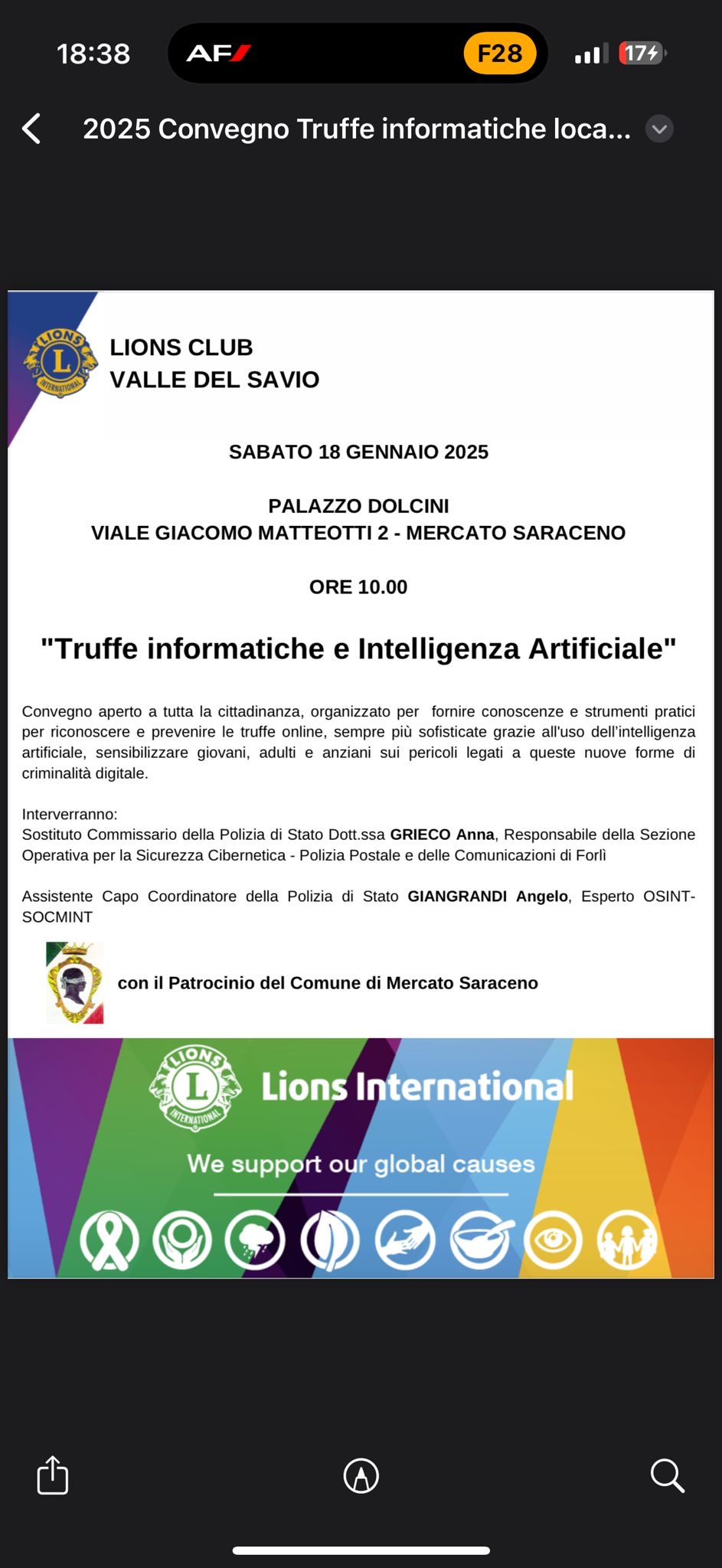 Questa mattina, il nostro evento “Truffe informatiche e Intelligenza Artificiale”, organizzato dal Lions Club Valle del Savio, ha visto una grande partecipazione e un coinvolgimento straordinario del pubblico.