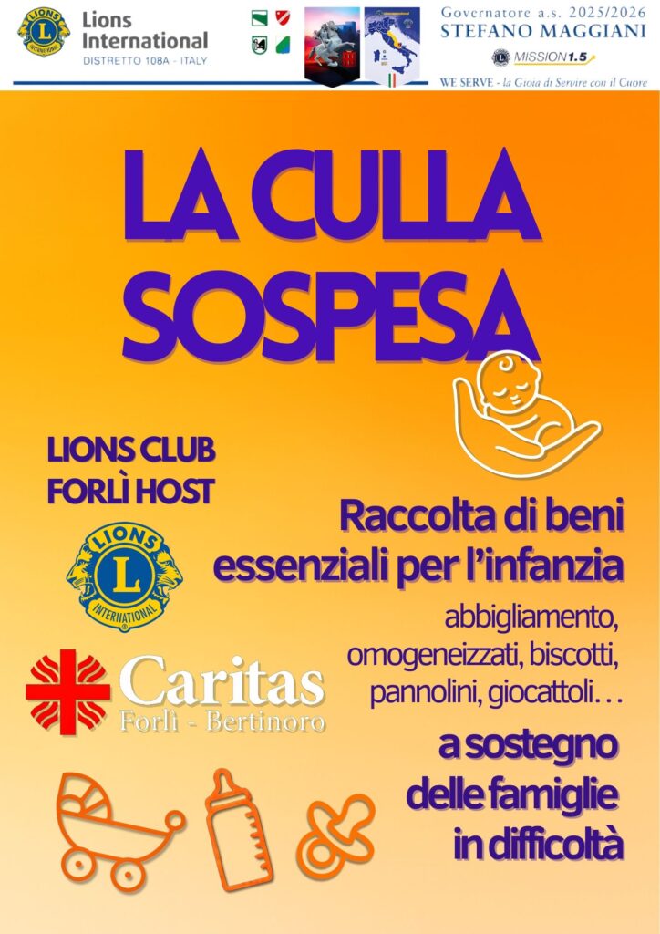 È iniziata, l’ultima settimana di febbraio, la Culla Sospesa, la raccolta solidale promossa dal Lions Club Forlì Host per sostenere le famiglie in difficoltà attraverso la donazione di beni essenziali per la prima infanzia. L’iniziativa, realizzata in collaborazione con la Caritas Diocesana di Forlì‑Bertinoro, mira a reperire prodotti indispensabili per i neonati: omogeneizzati, pappe, latte in polvere, pannolini, tutine, corredini e altri materiali di prima necessità.