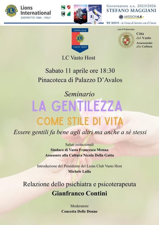 Sala gremita ieri pomeriggio presso la Pinacoteca di Palazzo D’Avalos per il seminario “La gentilezza come stile di vita”, promosso dal Lions Club Vasto Host e aperto all’intera comunità. Un evento che è stato, non solo, un invito alla riflessione, ma,anche, uno stimolo concreto all’azione individuale e collettiva, in un tempo in cui la gentilezza si conferma sempre più come un autentico principio civile ed una competenza necessaria.