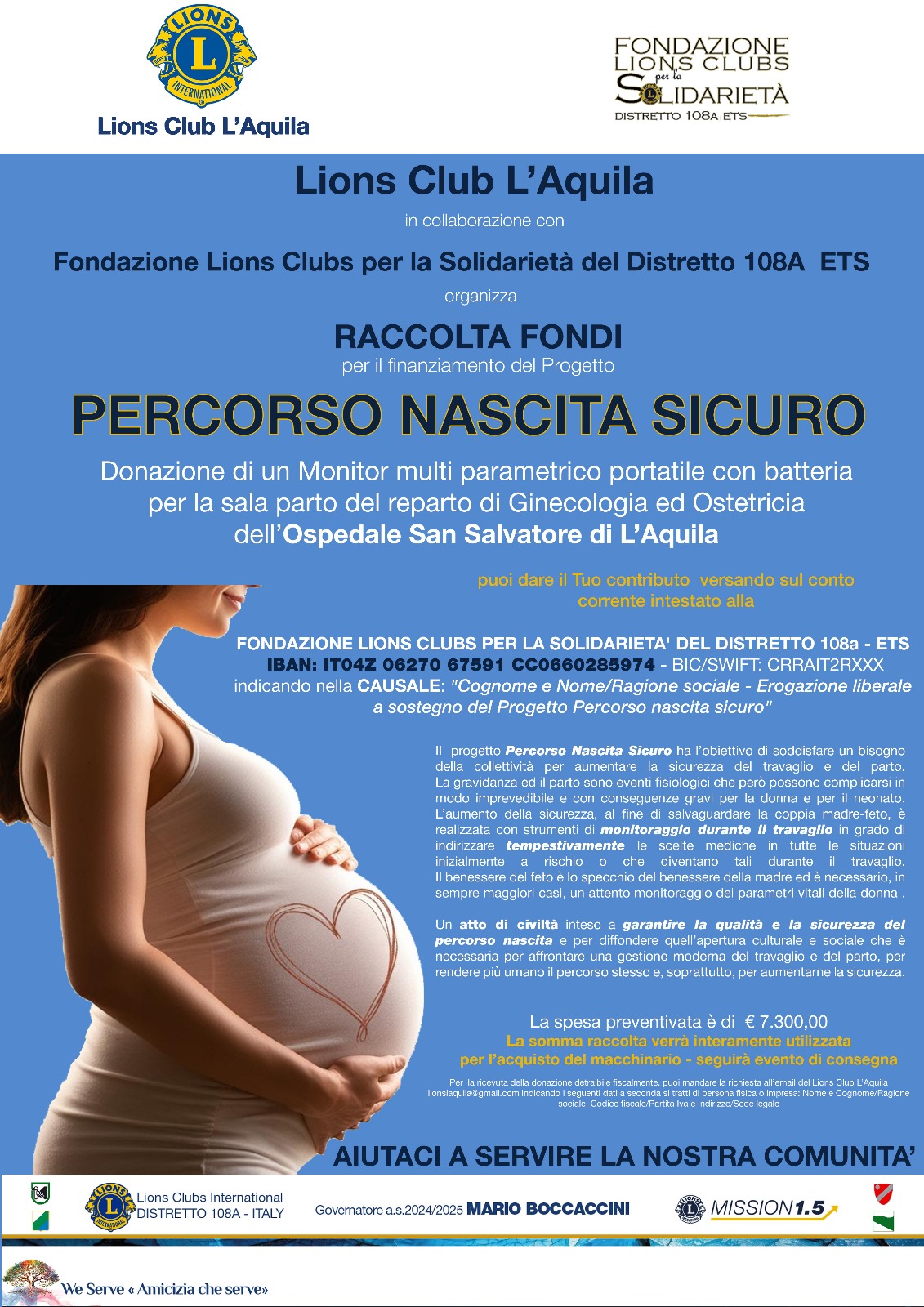 Il Lions Club L’Aquila, in collaborazione con la Fondazione Lions Clubs per la Solidarietà del Distretto 108A ETS, ha avviato una raccolta fondi per finanziare il progetto “Percorso Nascita Sicuro”, volto a supportare il reparto di Ginecologia e Ostetricia dell’Ospedale San Salvatore di L’Aquila.