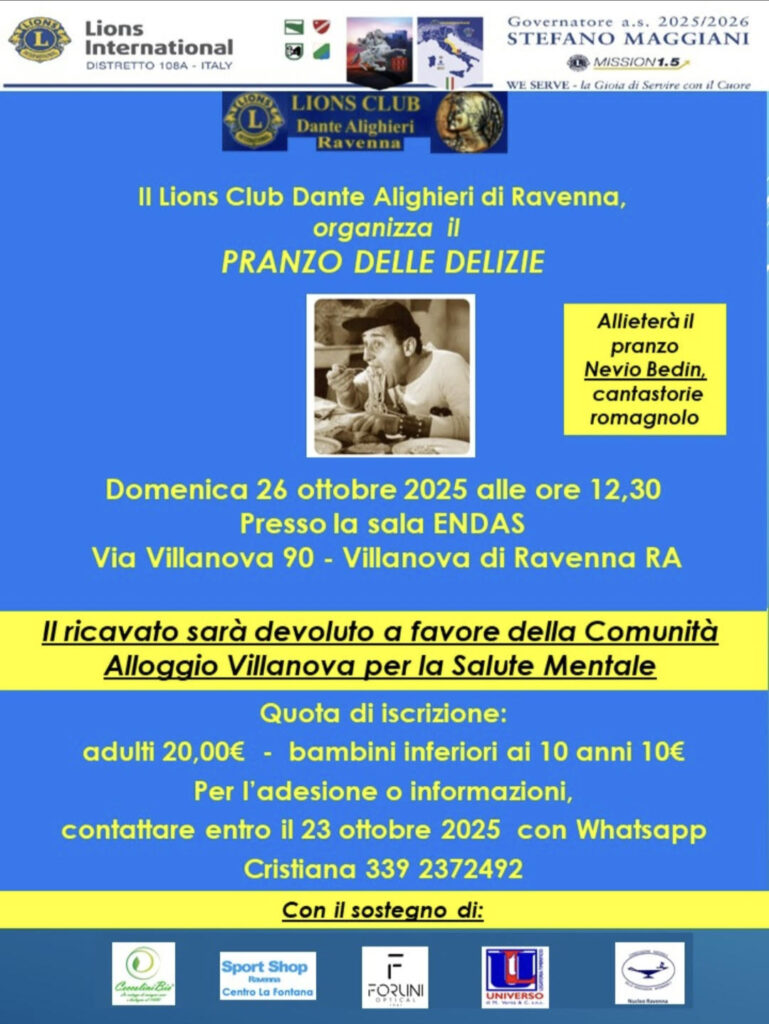 Il Lions Club Ravenna Dante Alighieri , presieduto da Giorgio Palazzi Rossi, organizza domenica 26 ottobre 2025 presso la sala Endas di Villanova Di Ravenna, in Via Villanova 90, un PRANZO DELLE DELIZIE , che mette in pratica la solidarietà, obiettivo primario di ogni Service lionistico.