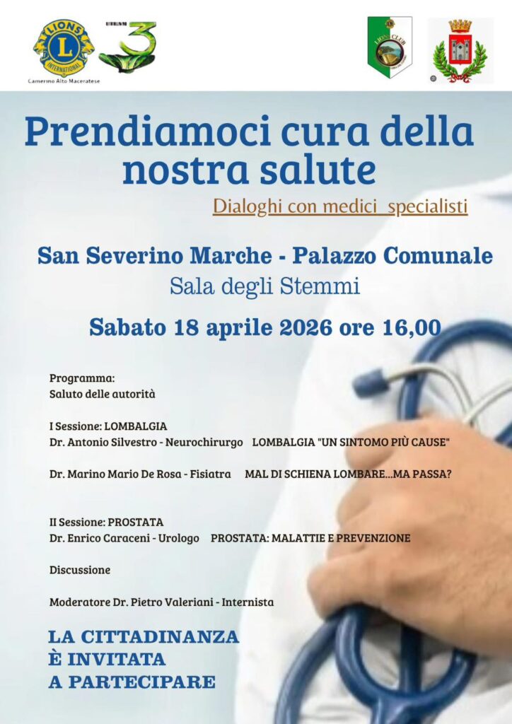 Il Lions Club Camerino Alto Maceratese, insieme al Lions Club Castelfidardo Riviera del Conero e all’Università della Terza Età, con il patrocinio del Comune di San Severino Marche (presente un rappresentante della Giunta), ha organizzato un partecipato incontro a beneficio della nostra Salute.