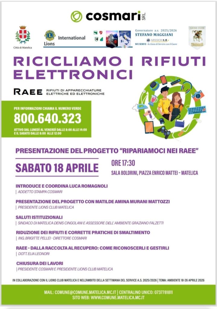 Riciclo rifiuti elettronici – LC Matelica, 18 aprile 2026 da Responsabile sito | 13 Apr, 2026 | Distretto 108A, Notizie dei Clubs | 0 commenti