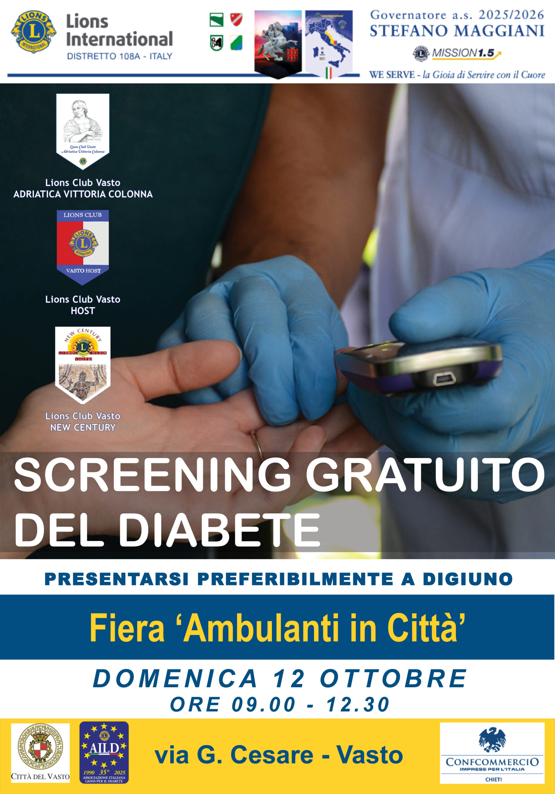 Alla fiera di domenica, lo screening gratuito della glicemia promosso dai Lions vastesi. I Lions Club Vasto Adriatica Vittoria Colonna, Vasto Host e Vasto New Century promuovono, con il patrocinio di AILD-Associazione Italiana Lions per il Diabete, lo screening gratuito della glicemia, service globale del Lions International in un momento in cui il diabete ha assunto i connotati di una pandemia. Domenica 12 ottobre, a partire dalle ore 9.00, sarà possibile sottoporsi gratuitamente al controllo presso lo stand predisposto dai soci dei sodalizi vastesi in via Giulio Cesare, nel corso della Fiera Ambulanti in città. L’attività di servizio, che nel corso degli anni ha permesso di rilevare molte criticità da sottoporre all’attenzione dei medici specialisti, sarà resa possibile grazie alla collaborazione del Comune della Città del Vasto e di Confcommercio. Presso lo stand, i prelievi saranno effettuati da personale sanitario mentre alcuni medici saranno a disposizione per attenzionare, appunto, le criticità e dispensare consigli utili su prevenzione, stile di vita e percorsi diagnostici. Un appuntamento da non perdere.