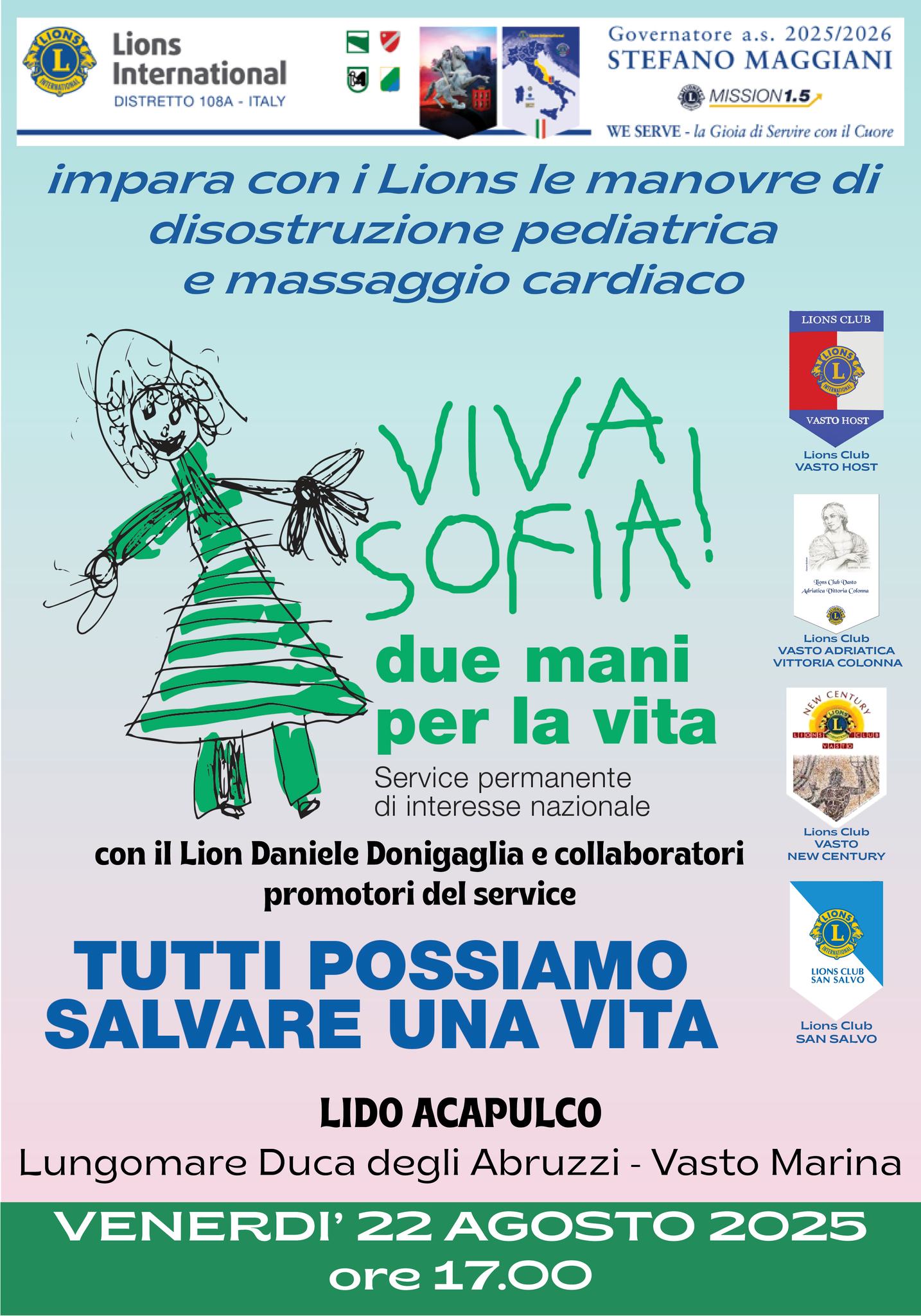 L’evento è giunto a conclusione di una intera giornata che i Lions della provincia teatina hanno dedicato al service Viva Sofia! Due mani per la Vita curato dal Lion Daniele Donigaglia e dal suo team che da anni porta avanti una massiccia campagna di sensibilizzazione e di informazione su tali metodiche che devono essere alla base del comune patrimonio di conoscenze perché possono fare la differenza.